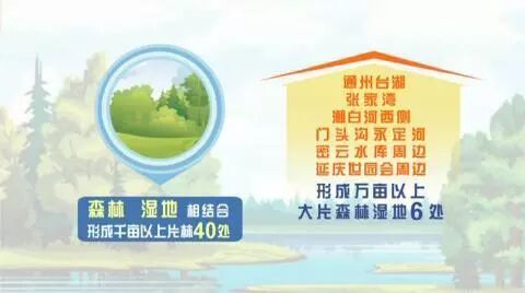 森林、湿地相结合,形成千亩以上片林40处,在通州台湖、张家湾、潮白河西侧、门头沟永定河、密云水库周边、延庆世园会周边,形成了万亩以上大片森林湿地6处。